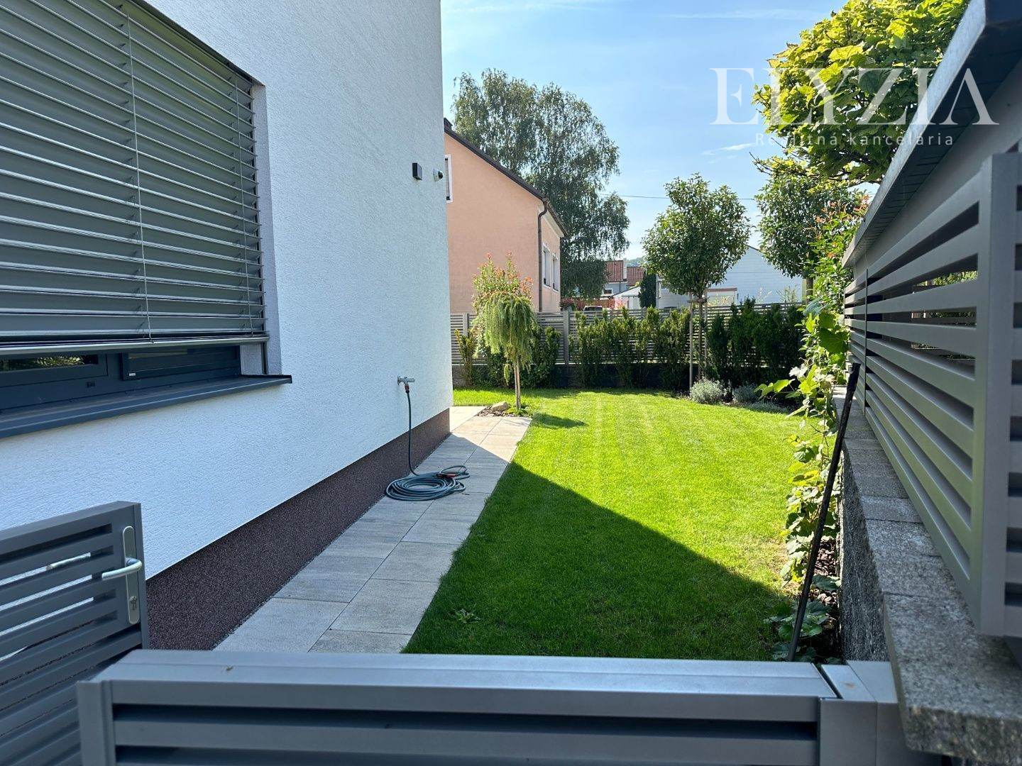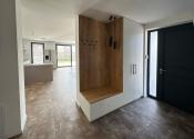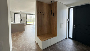 Vstupná chodba disponuje odkladacím priestorom vyrobeným na mieru, k dispozícii je práčka a chladnička. Dom sa prenajíma nezariadený. Terasa je pokrytá trávnatým porastom a využíva systém automatickej kosačky. Parkovanie je možné z boku domu alebo pred domom.