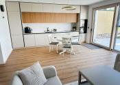 Vstup do predsiene, technická miestnosť, samostatná toaleta, kúpeľňa, kuchyňa s obývacou izbou a výstupom na terasu